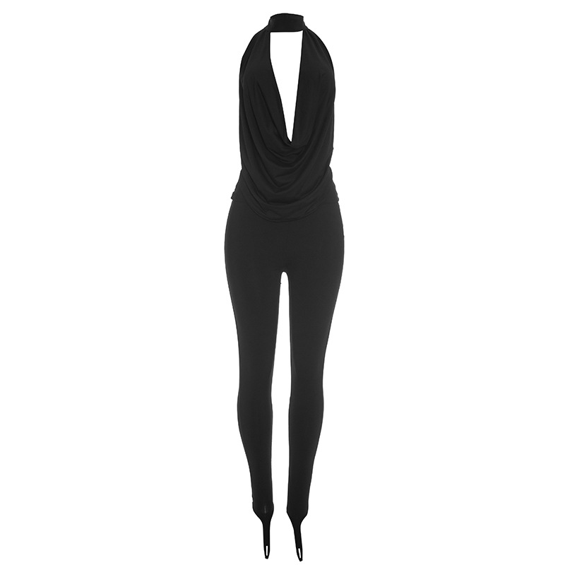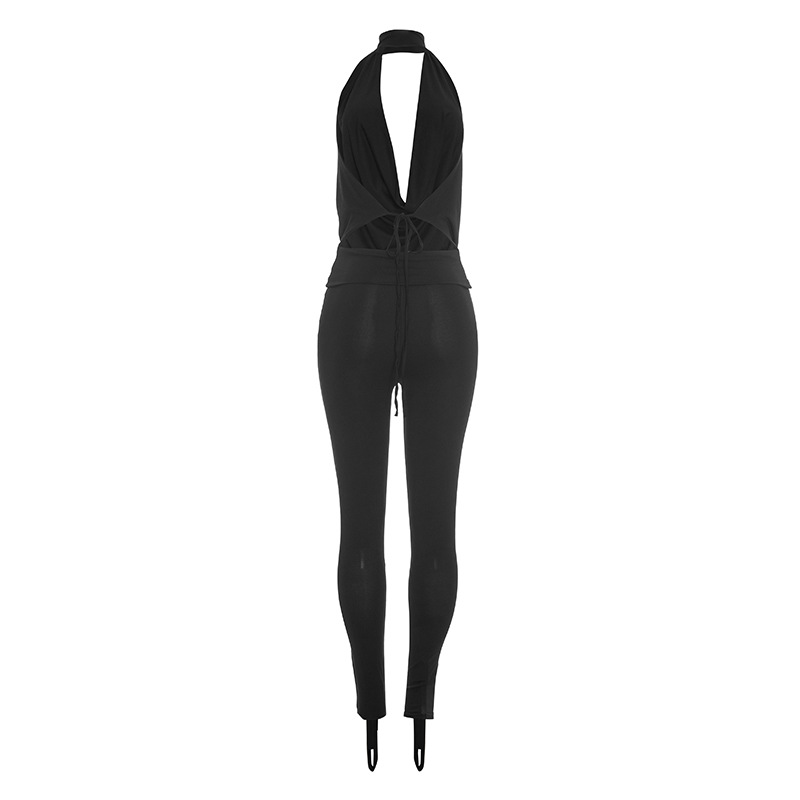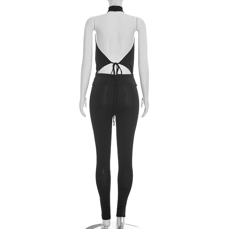 Features: Solid-color design, patchwork construction, appliqué/patch details, backless lace-up slip dress paired with matching long pants—a two-piece set